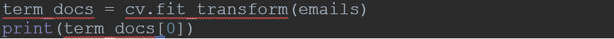 Here the max_features parameter set to 100 means it will consider 100 most frequent terms. We can change the parameter to achieve better accuracy. This vectorizer change the email matrix (rows of word) to term matrix where each row is a term frequency vector for an email.