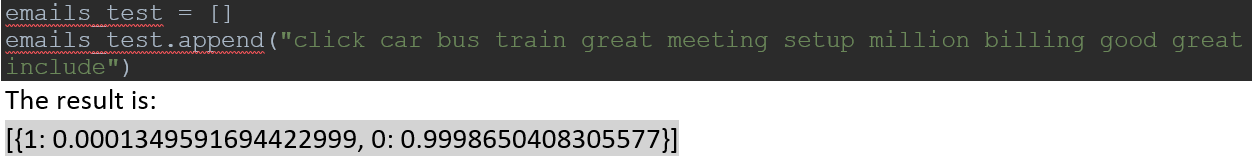 Now the result shows this testing sample is Ham email because probability for ham is near about 100% and spam is less than 1%.